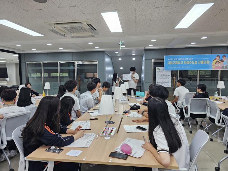 [시흥시 세계타임즈=송민수 기자] 서해고등학교는 7월 둘째주를 학교자율과정 기간으로 정하고 전교 학생과 선생님들이 참여하여 학생들의 시민적 역량을 기르기 위한 학년별 융합수업과 팀별 심화 프로젝트를 운영하였으며, 다양한 외부특강을 진행하였다.
