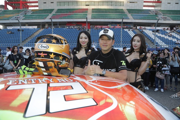 [사진설명] 팀106의 류시원(가운데) 감독이 지난 8월 11일 인제 스피디움에서 열린 2018 CJ대한통운 슈퍼레이스 챔피언십 5라운드 그리드워크 행사에서 팬들의 촬영요구에 포즈를 취하고 있다.