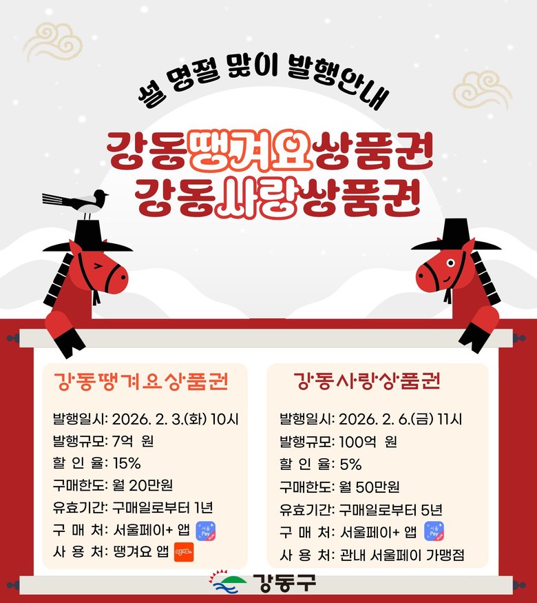 명절 이후에도 소비 회복 흐름이 이어질 수 있도록 강동땡겨요상품권은 3월과 4월에 각각 7억 원씩, 강동사랑상품권은 4월에 40억 원을 추가 발행할 계획이다. 두 상품권 모두 서울페이플러스 앱을 통해 구매할 수 있다.
