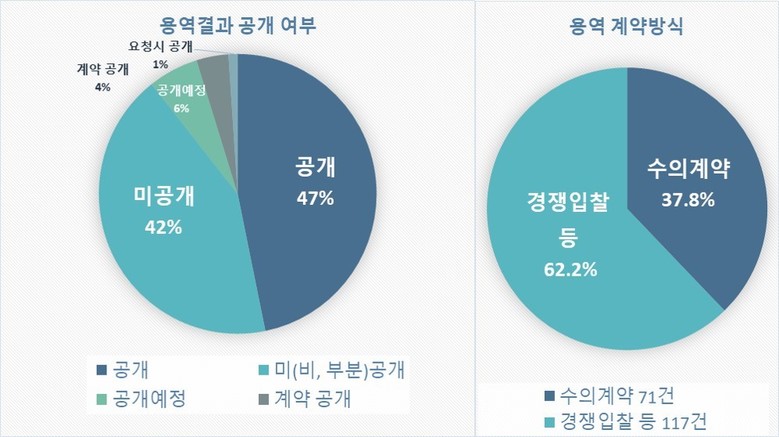 우선 경남도의 경우 전체 용역 10건 중 4건 이상 결과를 공개하지 않았고*, 역시 10건 중 4건 가까이 수의계약**으로 진행했다.