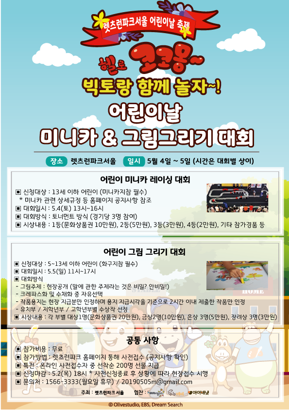 미니카 레이싱 대회와 그림 그리기 대회는 5월 2일(목) 오후 6시까지 사전 접수를 받고 있다. 사전접수자 중 선착순 200명에게 현장에서 어린이 음료 등 선물을 증정한다.