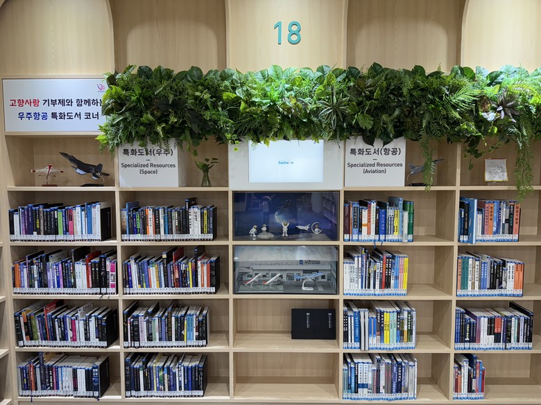 그리고, 관련 서가에는 우주와 항공을 주제로 한 디스플레이와 사천시 항공 우주 관련 홍보영상 함께 구성돼 시각적 몰입감을 더했다.