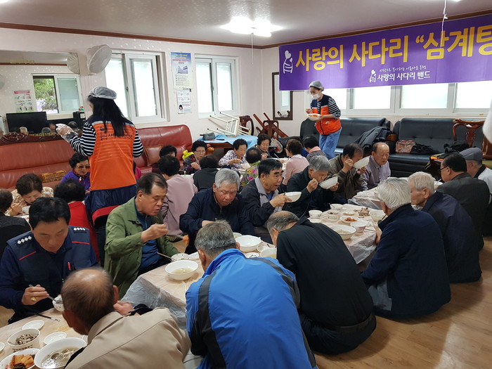 85세 김정숙 어르신은 “사랑의 사다리 밴드 봉사단체에서 아침 일찍부터 준비한 삼계탕과 닭죽을 정말 맛있게 먹었다.“면서 감사함을 전했다.