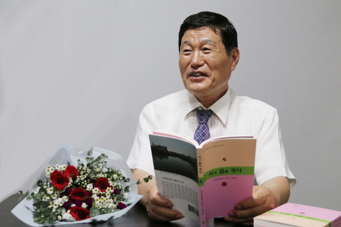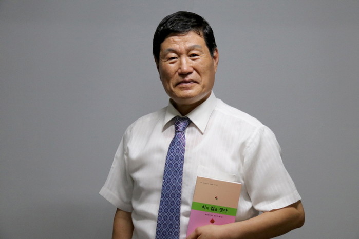 (사진=시집 한실문예창작 동인지 제15집 '시의 집을 짓다'를 들고 있는 박덕은 시인)