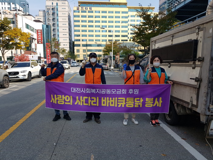 [대전=세계타임즈 이채봉 기자] 대전광역시 SNS 일만명 봉사단체 사랑의 사다리 밴드(리더 이정제)는 26일 오후1시~오후3시에 서구 만년동에 위치한 (사)대전시지체장애인협회 서구지회(회장 권준석)에서 바비큐 통닭 50마리 봉사로 우리 사회의 따뜻한 사랑을 실천하였다.