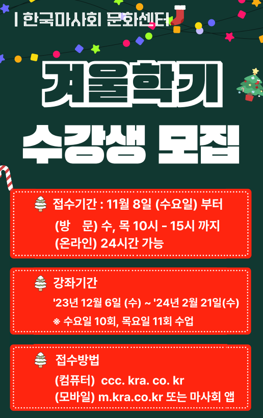 겨울학기 수강신청은 수, 목요일에 지역별 지사를 방문하거나 한국마사회 문화센터 홈페이지를 통해 가능하며, 신청 마감은 오는 11월 30일까지다. 한국마사회는 이번 수강신청기간 동안 온라인 신규회원과 다자녀 부모, 사회적 약자 등에게 수강료를 50% 할인해 주는 이벤트를 실시하고 있다. 문화센터와 관련한 기타 자세한 내용은 홈페이지에서 확인할 수 있다.
