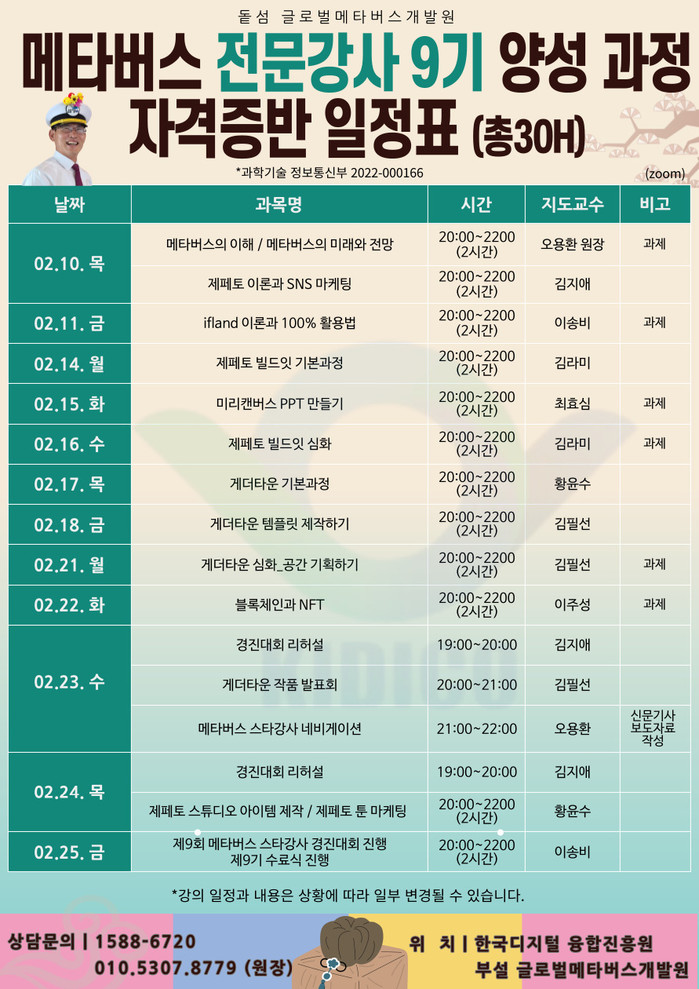 한편, 글로벌메타버스개발원이 2주 (30시간) 15강좌로 오후 8시부터 10시까지 비대면(컴퓨터와 스마트폰)으로 진행되는 메타버스전문강사 자격증 과정 수강료는 50만 원이다.