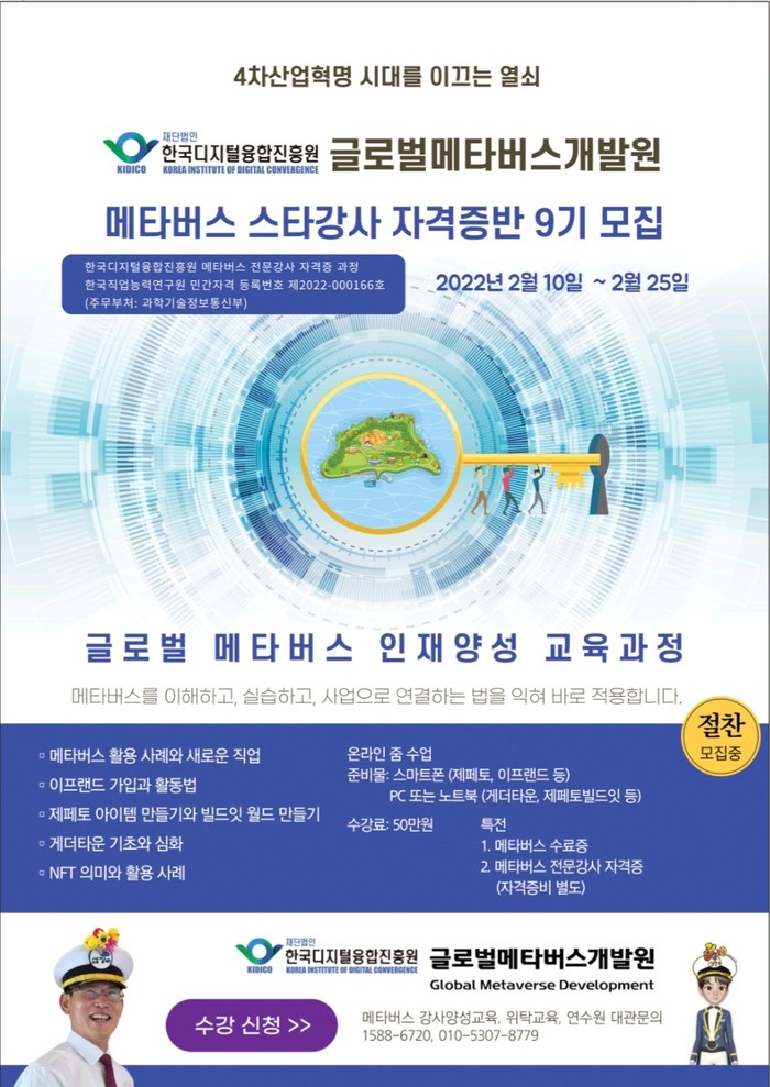 자세한 문의는 한국디지털융합진흥원(www.kidico.or.kr) 글로벌메타버스개발원 오용환 원장(1588-6720 과 010-5307-8779)으로 확인하면 된다.