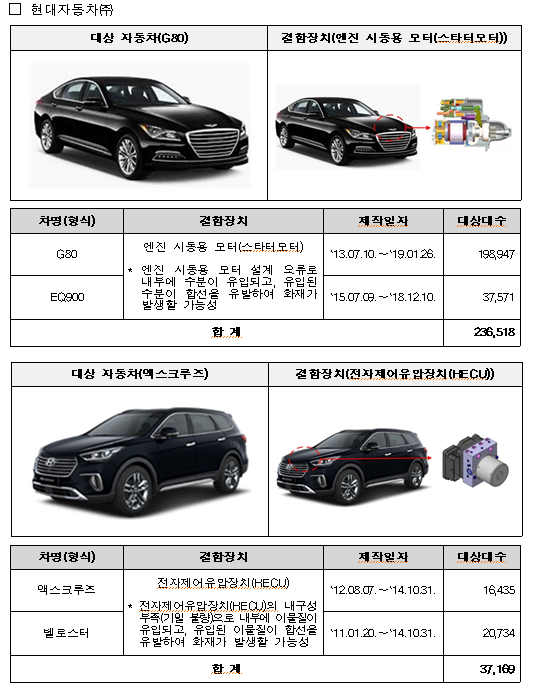 ① (현대) G80 등 2개 차종 236,518대는 엔진 시동용 모터 설계 오류로 화재가 발생할 가능성으로, 맥스크루즈 등 2개 차종 37,169대는 전자제어유압장치(HECU) 내구성 부족으로 화재가 발생할 가능성으로 6월 27일부터 시정조치에 들어간다.