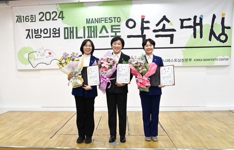 [광주 세계타임즈=손권일 기자] 광주광역시의회 명진, 이귀순, 신수정 의원이 “2024년 지방의원 매니페스토 약속대상” 좋은 조례 분야 수상자로 선정되었다.