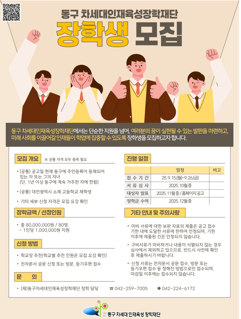 장학금 신청과 관련한 세부 내용은 동구청 누리집에서 확인할 수 있으며, 문의는 동구 차세대인재육성장학재단 사무국(☎042-259-7005)으로 하면 된다.