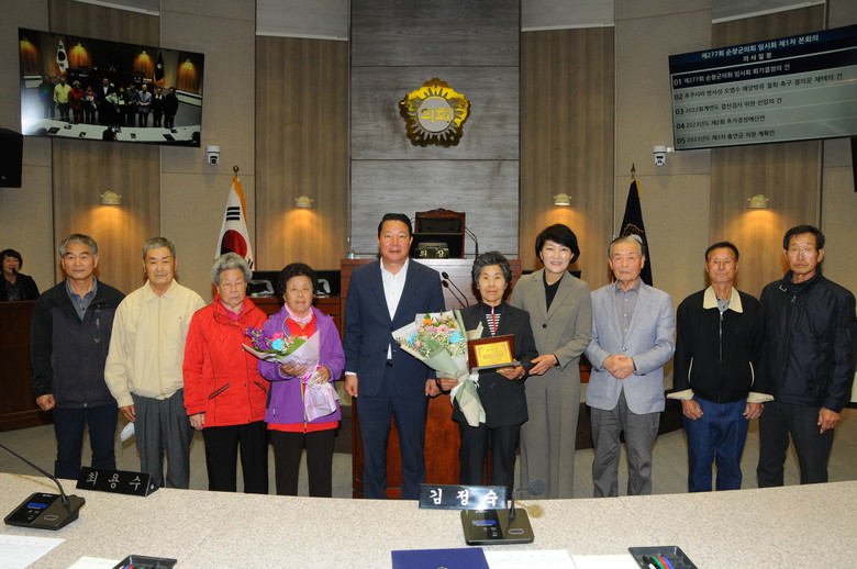 이날 본회의 개회에 앞서 순창읍 충신1마을 고영숙 부녀회장이 군민이 공감하는 신뢰받는 의회 발전의 공을 인정 받아 순창군의회의장이 수여한「2023년 의정발전 유공 민간인 표창패」를 전달받았다.