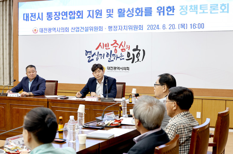 대전시의회가 주최하고 산업건설위원회와 행정자치위원회가 주관한 이번 토론회는 송대윤, 이용기 의원이 공동 좌장을 맡았으며, 5개 자치구를 대표하는 10명의 통장연합회 회원들과 대전시 자치행정과장 등이 참여했다.