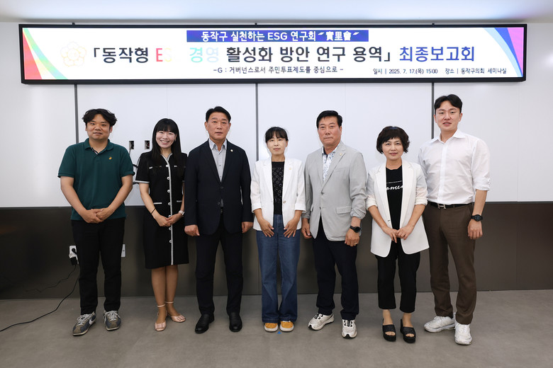 이날 보고회에는 김영림 대표의원과 정재천, 정유나, 변종득, 노성철 의원, 서경대학교 산학협력단 연구원들이 참석해 그동안의 연구 성과를 공유했다. 연구모임은 동작구 주민참여제도 현황을 파악하고 국내·외 주민참여 및 ESG경영 선진사례를 분석한 결과를 바탕으로, 주민투표 활성화 실행 전략과 동작구형 ESG 거버넌스 모델 확립을 위한 과제를 도출했다.