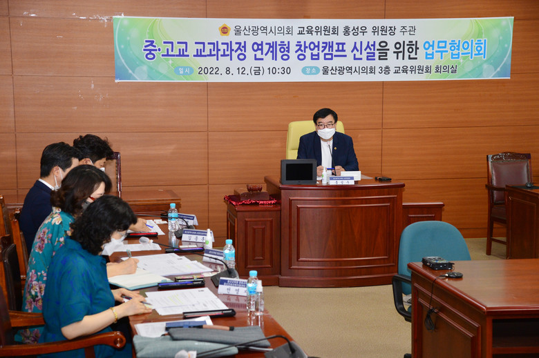 [울산 세계타임즈=이호근 기자] 울산광역시의회 홍성우 교육위원장은 12일 오전 10시 30분, 교육위원회 회의실에서 ‘중.고교 교과과정 연계형 창업캠프 신설을 위한 업무협의회’를 개최했다.