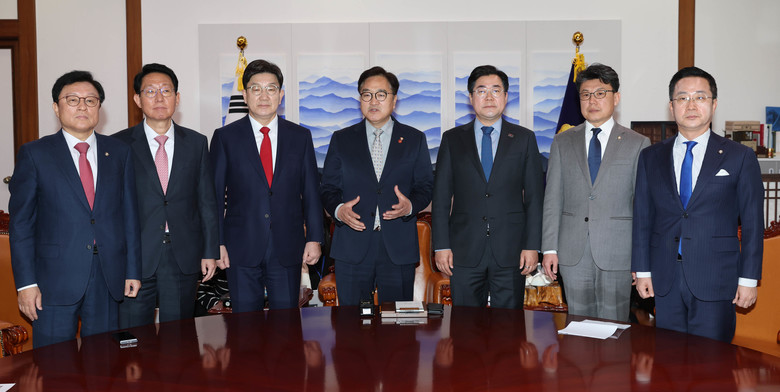 왼쪽부터 박형수 국민의힘 원내수석부대표, 김상훈 정책위의장, 권성동 원내대표, 우 의장, 박찬대 더불어민주당 원내대표, 진성준 정책위의장, 박성준 원내수석부대표. 2025.3.18 [공동취재]