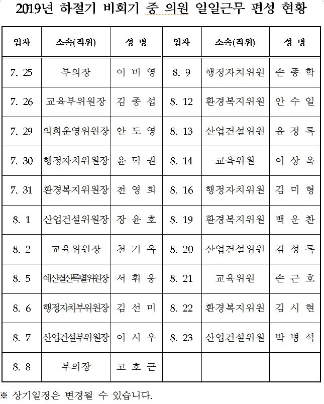 이에 따라 하절기 비회기 중이라도 불편사항이나 민원사항이 있을 경우 시의회를 방문하거나, 시의회 운영전문위원실(229-5063) 또는 당직 의원실로 문의를 하면 당직의원이 민원과 직접 상담한 후 해당부서와 협의를 하는 등 민원 해결에 나선다.