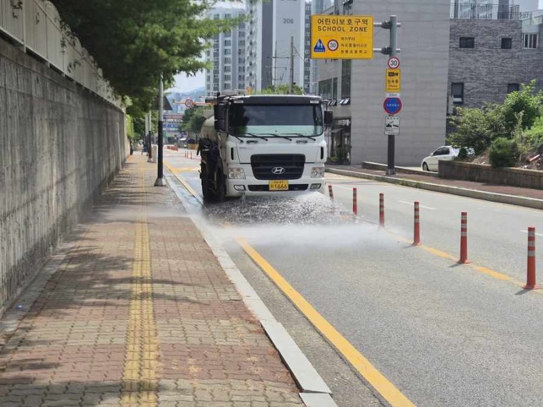 천안시는 시공사와의 긴밀한 협조체계를 구축하고 유동인구가 많은 동지역을 중심으로 주요 도로에서 살수작업을 집중적으로 시행한다.