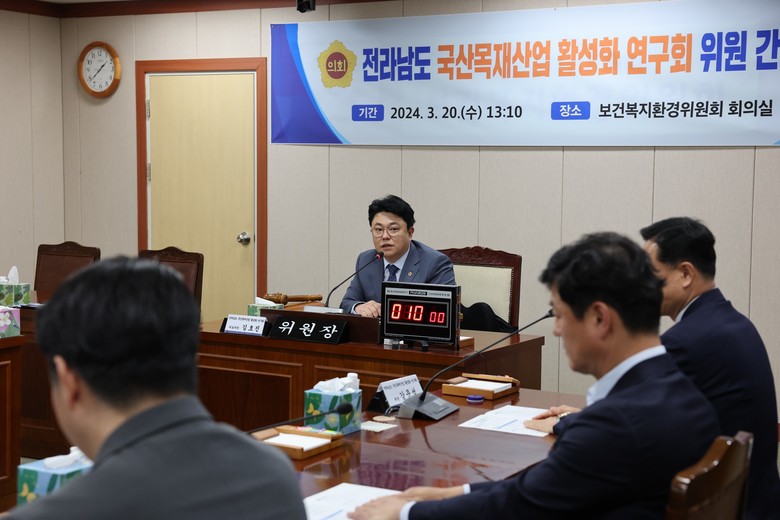 [전남 세계타임즈=우덕현 기자] 전남도의회 ‘전라남도 국산목재산업 활성화 정책연구회’(대표위원 김호진)는 지난 20일 도의회 보건복지환경위원회 회의실에서 간담회를 갖고 본격적인 활동에 들어갔다.