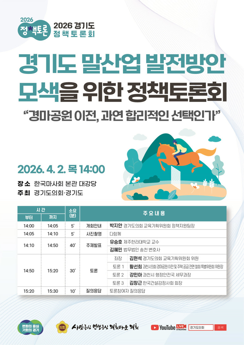 이날 토론회에는 말산업 관계자, 학계, 유관기관, 과천 및 경마공원 주변 지역 관계자 등 각계 전문가들이 참석해, 경마장 이전에 따른 말산업 전반의 영향과 지역 연계 파급효과를 짚어보고, 과천과 경마공원 주변을 포함한 발전 방향 및 말산업 경쟁력 강화를 위한 정책적 대안을 심도 있게 논의할 예정이다.