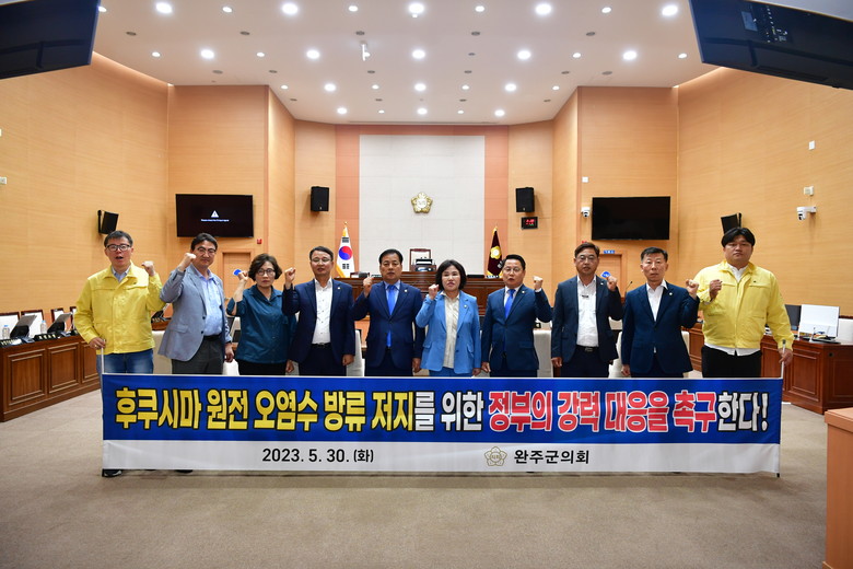완주군의회는 성명서를 통해 “지구 환경을 파괴하고, 인류의 안전을 위협하는 중대한 사안이며, 인접해 있는 대한민국의 해양오염 인한 수산물에 대한 피해가 우려되는 상황임에도 정부에서는 안일한 대처로 우리 대한민국의 식량 주권을 위협하고 있다”고 성토하고 “정부가 적극적으로 나서 강력히 대응해야 함에도 ‘마셔도 되는 식수’운운하며, 무책임한 행동으로 온 국민을 불안에 떨게 하고 있다”고 밝혔다.