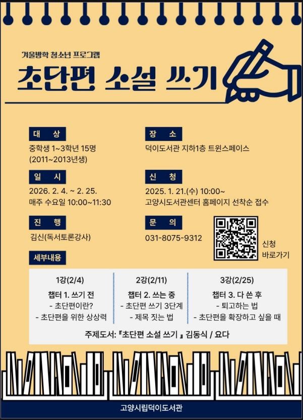 청소년 대상 프로그램 ‘초단편 소설 쓰기’는 2월 4일부터 2월 25일까지 매주 수요일 오전 10시부터 11시 30분까지 총 3회 운영된다. 대상은 중학교 1~3학년 15명으로, 동일하게 트윈스페이스에서 진행된다.
