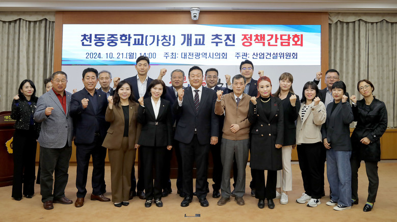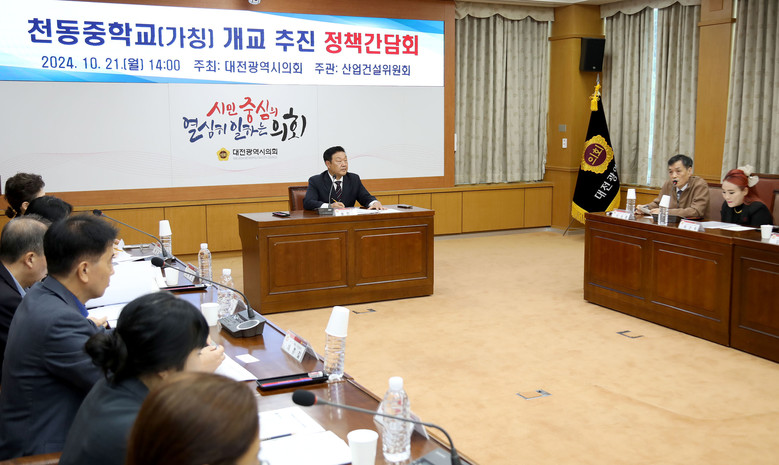 [대전 세계타임즈=이채봉 기자] 대전시의회는 21일 의회 소통실에서 송인석 의원(국민의힘, 동구 1)주재로 ‘천동중학교(가칭) 개교 추진 정책간담회'를 개최했다.