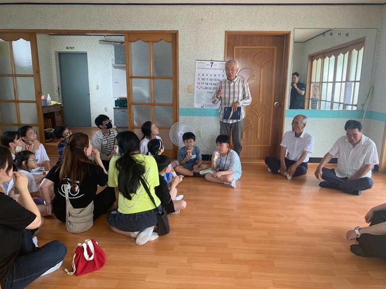 | ▲ 작천초 학생들이 교동마을 어르신들을 만나 ‘선돌감기’에 대한 설명을 듣고 있다. |
