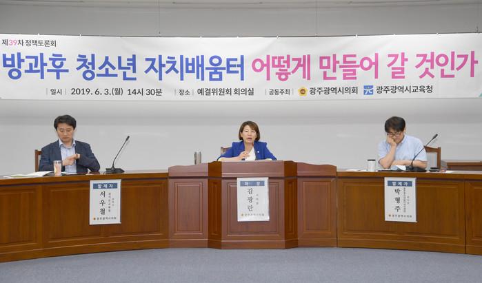 토론회는 광주시의회 김광란(민주, 광산4)의원이 좌장을 맡고 발제로는 서우철 경기도교육청 마을교육공동체정책과 장학사, 박형주 광주광역시 청소년삶디자인센터장이 나섰고 이민철 광주광역시의회 정책네트워크 위원, 김희련 문산마을교육공동체 활동가, 안석 광주광역시교육청 시민참여담당관, 손옥수 광주광역시청 청년정책과장이 토론자로 참여했다.