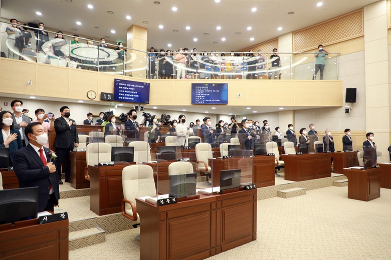 한편, 국민의힘 소속 의원 7명은 부의장 선출과 관련 원 구성에 대한 항의 표시로 불참한 가운데 더불어민주당 소속 의원 13명만 개원식에 참석했다.