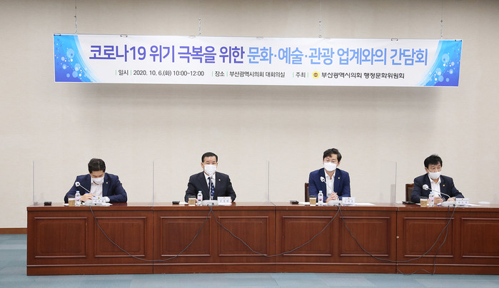 [부산=세계타임즈 장경환 기자] 부산시의회 행정문화위원회는 10월 6일 오전 10시 부산시의회 대회의실에서‘코로나19 극복을 위한 문화·예술·관광 업계와의 간담회’를 개최하였다.