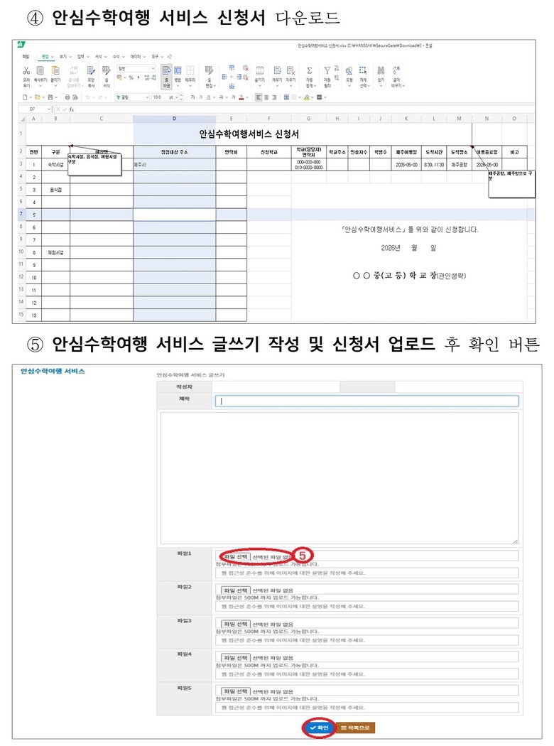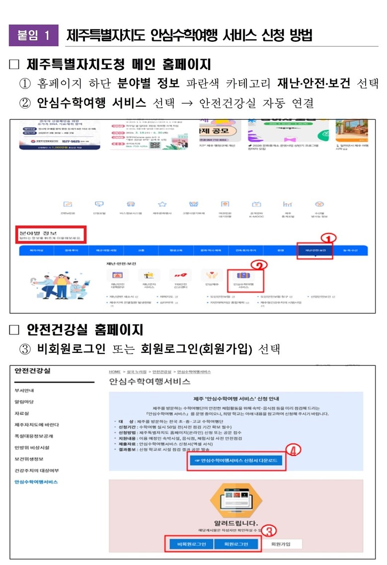 이에 따라 각 학교는 기존에 공문으로 시설 안전점검 결과(숙박시설, 음식점, 체험시설 등의 사전 안전 및 위생점검, 안전 위협 요인 조치 결과)를 신청하던 방식에서 벗어나 제주특별자치도청 누리집에서 안전점검 결과를 신청해 회신받을 수 있게 됐다.