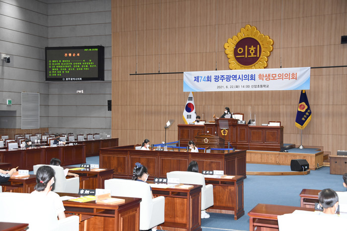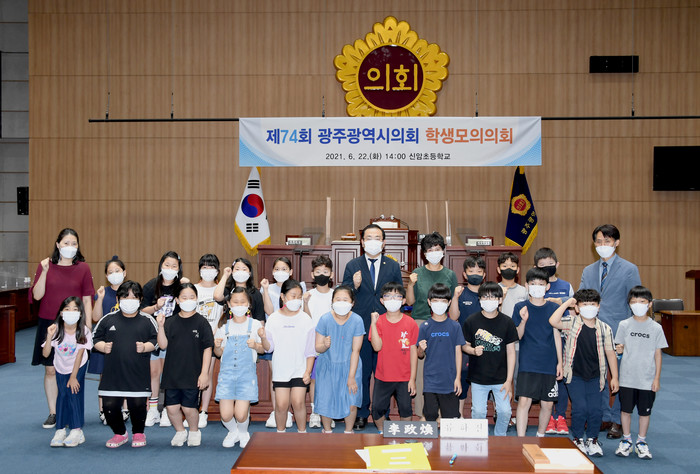 이번 학생 모의의회는 김용집 의장과 신암초등학교와 광주동초등학교가 지역구인 송형일·신수정 의원이 참관한 가운데 학생 30여명이 참여했다. 회의는 조례안 심의·의결, 2분 자유발언 등 지방의회 의정 활동을 직접 체험하는 기회의 장으로 진행됐다.