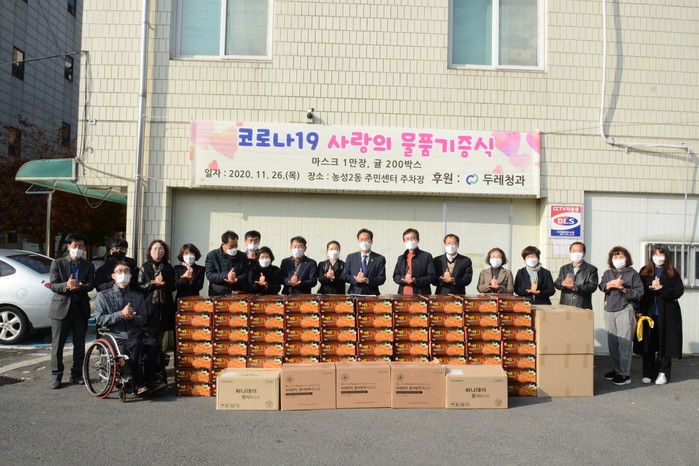 두레청과(주) 한수영 대표는 “코로나19 장기화로 모두 어려운 시기에 도움이 필요한 곳에 힘이 되고 싶어 마스크, 귤을 기부하게 됐다”며 “힘든 생활을 겪고 있는 이웃에게 조금이나마 보탬이 되길 바란다”고 말했다.