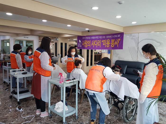 [대전=세계타임즈 이채봉 기자] 9천명 SNS 대전시 봉사단체 사랑의 사다리 밴드(리더 이정제)는 27일 오전10시, 중구 선화동 세명요양병원에서 60분의 어르신들 미용봉사로 사회적 효행을 실천하였다.