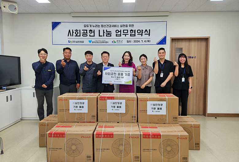 지난 4일 완주군정신건강복지센터는 ㈜삼진정공 전주공장과 지역주민의 정신건강증진을 위한 ‘사회공헌 나눔 협약식 및 물품기증식’을 진행했다.