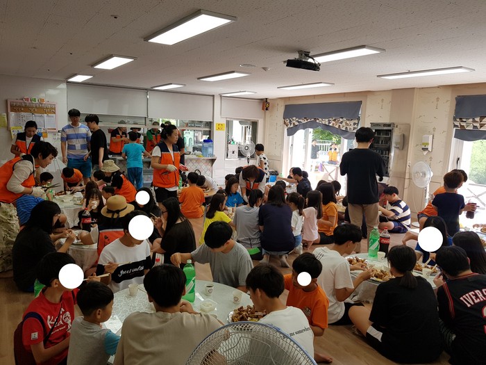 이날 통닭 봉사는 2018년 여름음악캠프에 참석한 아이들을 위해서 자원봉사자 20명이 참석하여 물놀이후에 간식으로 통닭을 전달했다.