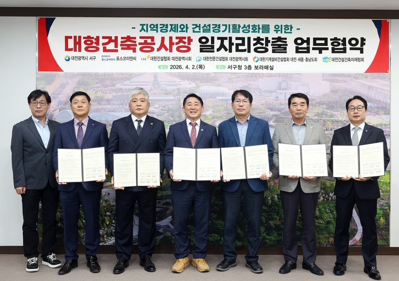 [서구 세계타임즈=이채봉 기자] 대전 서구는 침체된 건설경기 회복과 지역경제 활성화를 위해 구청 보라매실에서 관련 업체 및 협회들과 ‘대형 건축공사장 일자리 창출 업무협약’을 체결했다고 3일 밝혔다.