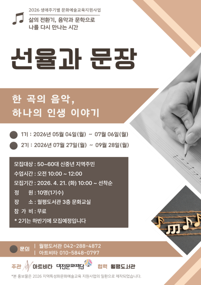 이번 프로그램은 도서관이라는 인문학적 공간에 음악적 감성을 결합해, 개인의 삶의 이야기를 예술적 결과물로 확장하는 데 초점을 맞췄다. 대전문화재단의 ‘생애주기별 문화예술 교육 지원사업’에 선정된 사업으로, 지역 예술단체 ‘노이에끌랑’, ‘아트비타’와 협력해 전문적인 교육과정을 제공한다.