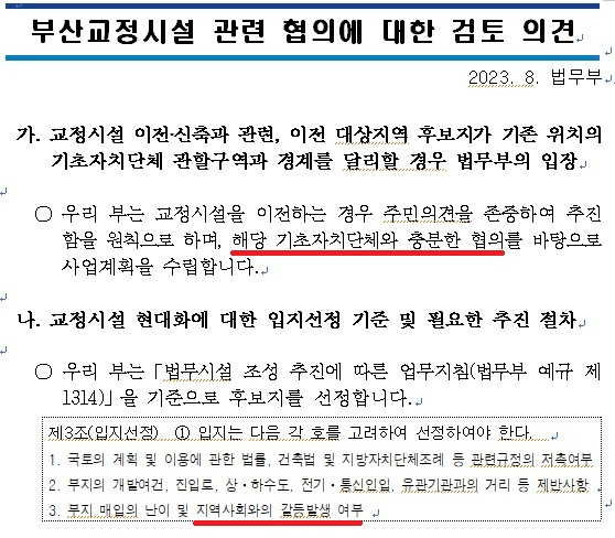 법무부가 부산시에 보낸 공문에 따르면, 법무부는 “교정시설을 이전하는 경우 주민의견을 존중하여 추진함을 원칙으로 하며, 해당 기초자치단체와 충분한 협의를 바탕으로 사업계획을 수립한다”라고 명시했다. 법무부가 공문을 통해 교정시설 입지선정 결정권자인 법무부의 원칙과 기준이 무엇인지 분명하게 보여준 것이다.