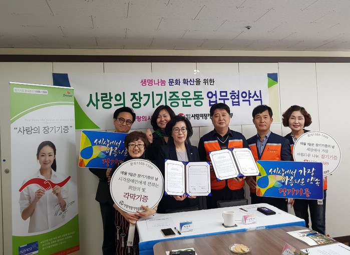이날 협약식에는 유희자 나눔봉사단장, 김호현 산악회장, 김준모 사랑의장기기증운동본부 홍보대사, 박선미, 박정선 회원들이 함께 하였다.