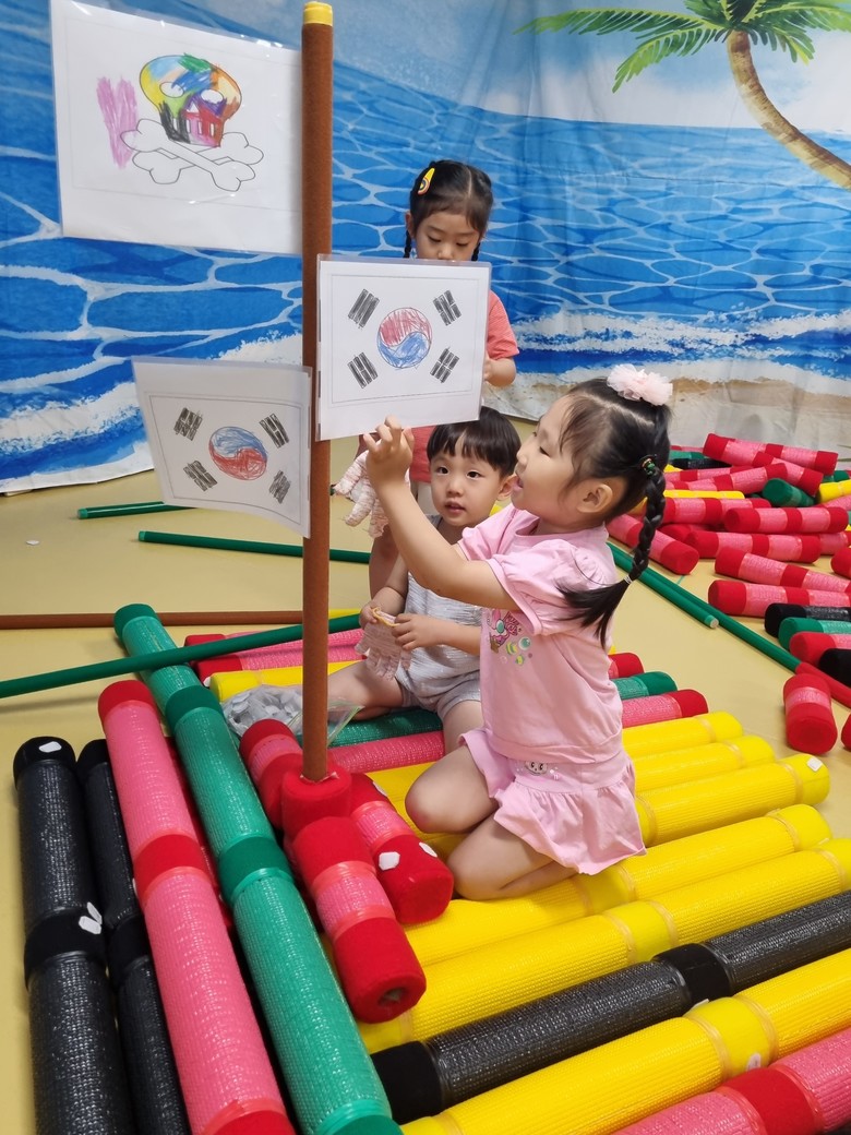 유아들은 뗏목에 대한 경험을 이야기 나누고 안전 수칙을 알아본 후 친구들과 협력하여 뗏목을 만들었으며 깃발을 세우고 상상력을 발휘하여 놀이하였다. 뗏목은 여객선이 되었다가 낚싯배가 되었으며 이순신의 거북선으로 변하였다. 또한 각자의 작은 뗏목이 합쳐지고 창의력이 더해져 큰 뗏목으로 만들어졌다.