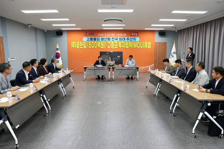 [고흥군 세계타임즈=우덕현 기자] 고흥군(군수 공영민)은 지난 25일 군청 팔영산홀에서 국내 김 산업 선도기업인 ㈜광천김(대표 김재유)과 500억 원 규모의 민간개발 투자협약(MOU)을 체결했다고 밝혔다.