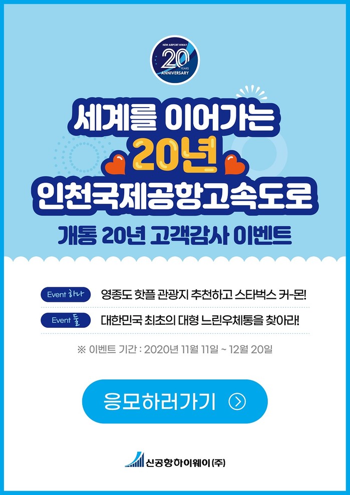 인천국제공항고속도로는 2000년도에 개통되어 인천국제공항과 수도권을 편하고 빠르게 이어주는 대한민국 관문도로의 역할을 수행하고 있다. 신공항하이웨이(주) 전영봉 사장은“인천국제공항고속도로를 사랑해준 고객들에게 보답하기 위해 20주년 기념 이벤트를 마련했다”며 20년의 추억을 나누는 이벤트에 고객 여러분의 많은 참여를 부탁 드린다”고 말했다.
