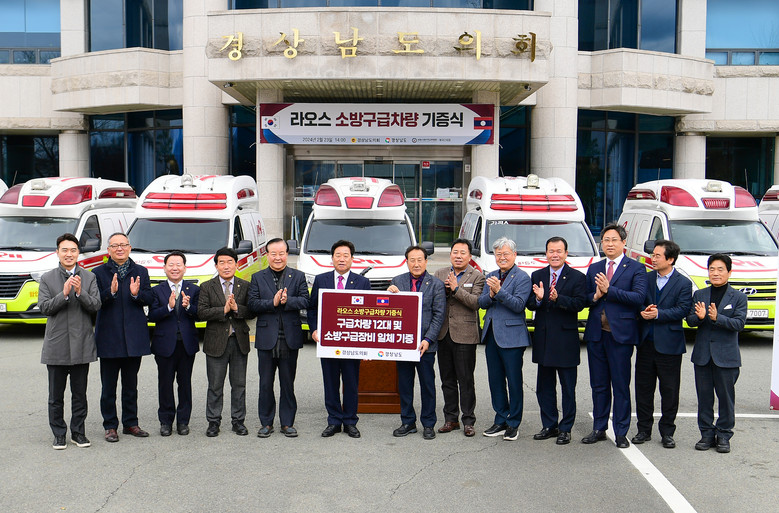 [경남 세계타임즈=최성룡 기자] 경남도의회(의장 김진부)가 지난 23일, 라오스*에 소방 특수구급차량 12대와 특수방화복 60착 등 소방용품을 기증한다고 밝혔다. 이 중 경남도의회와 우호교류협약 단체인 비엔티엔주에 10대, 인근 보께오주에 2대를 보내게 된다.