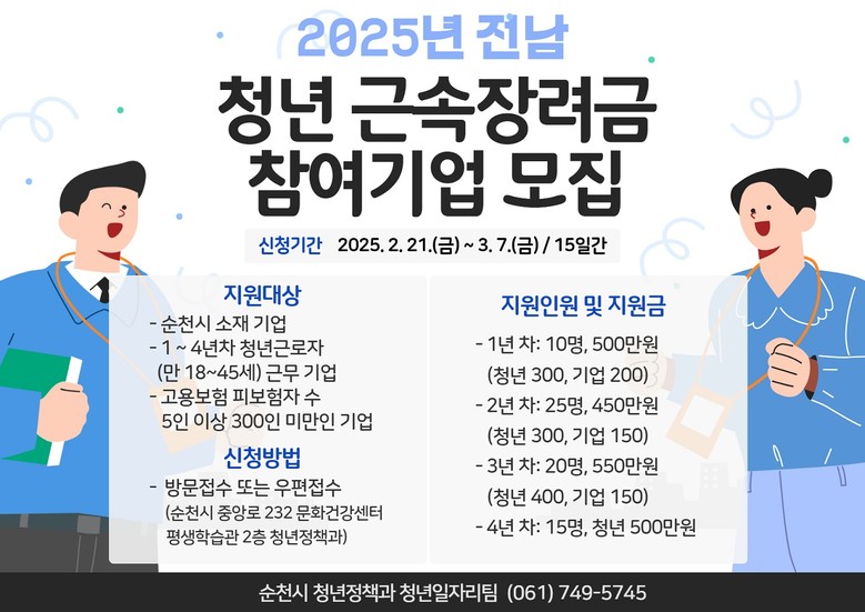 [순천시 세계타임즈=우덕현 기자] 순천시(시장 노관규)는 청년들의 정규직 일자리 취업 촉진과 장기근속 유도를 위해 청년 근속장려금 지원사업에 참여할 기업을 오는 3월 7일까지 모집한다고 밝혔다.