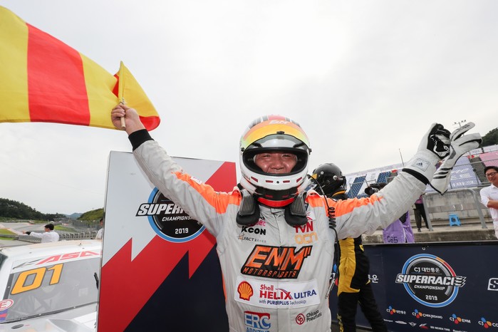 [사진설명] 오일기가 1일 강원도 인제군의 인제스피디움에서 열린 2019 CJ대한통운 슈퍼레이스 챔피언십 6라운드 ASA 6000 클래스에서 우승한 뒤 ‘오일기’를 흔들며 기뻐하고 있다.