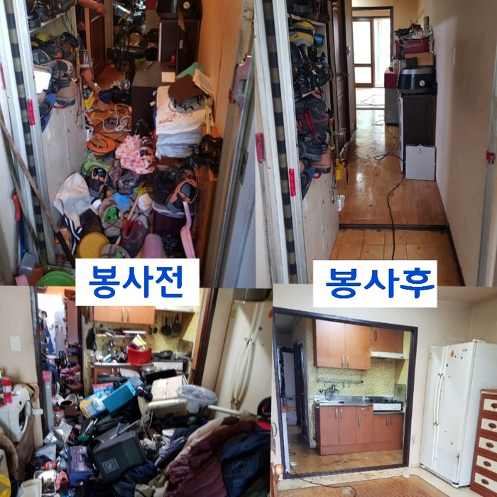 이날 봉사는 김호찬 단장을 비롯해서 자원봉사20명의 회원들이 집안쓰레기 약10톤을 수거 후 집안청소 봉사를 하였다.