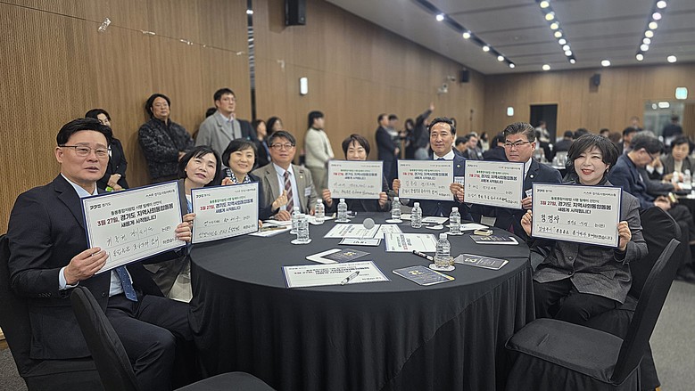 | ▲경기도의회 최종현 대표의원, 경기도의회 황세주 의원, 경기도사회서비스원 안혜영 원장, 경기도의회 김재훈 의원, 경기도의회 지미연 의원·김용성 의원·윤태길 의원·정경자 의원이 통합돌봄 릴레이 선언을 진행하고 있다.(사진=경기도사회서비스원) |
