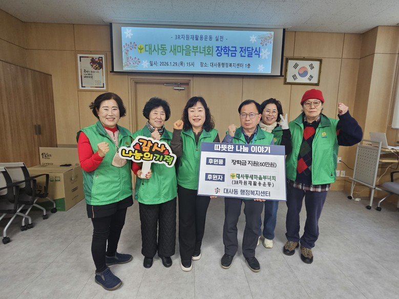 [중구 세계타임즈=이채봉 기자] 대전 중구 대사동(동장 유재경)은 29일 새마을부녀회(회장 곽인순)에서 3R[재사용(Reuse), 재활용(Recycle), 발생 줄이기(Reduce)] 자원재활용 운동의 일환으로 자원 수거 활동을 전개하여 마련한 수익금으로 지역 인재 육성을 위한 장학금 60만 원을 전달했다고 밝혔다.